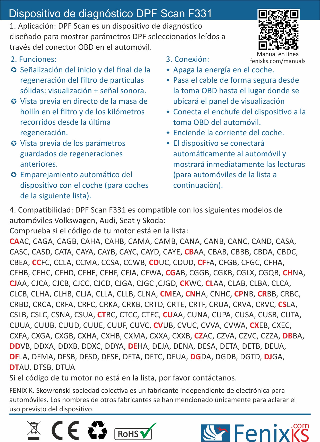 El DPF Scan F331 es compatible con una amplia gama de motores de automóviles Volkswagen, Audi, Seat y Skoda. Comprueba si el código de tu motor está en la lista incluida (ver sección de compatibilidad). En caso de duda, contáctanos.